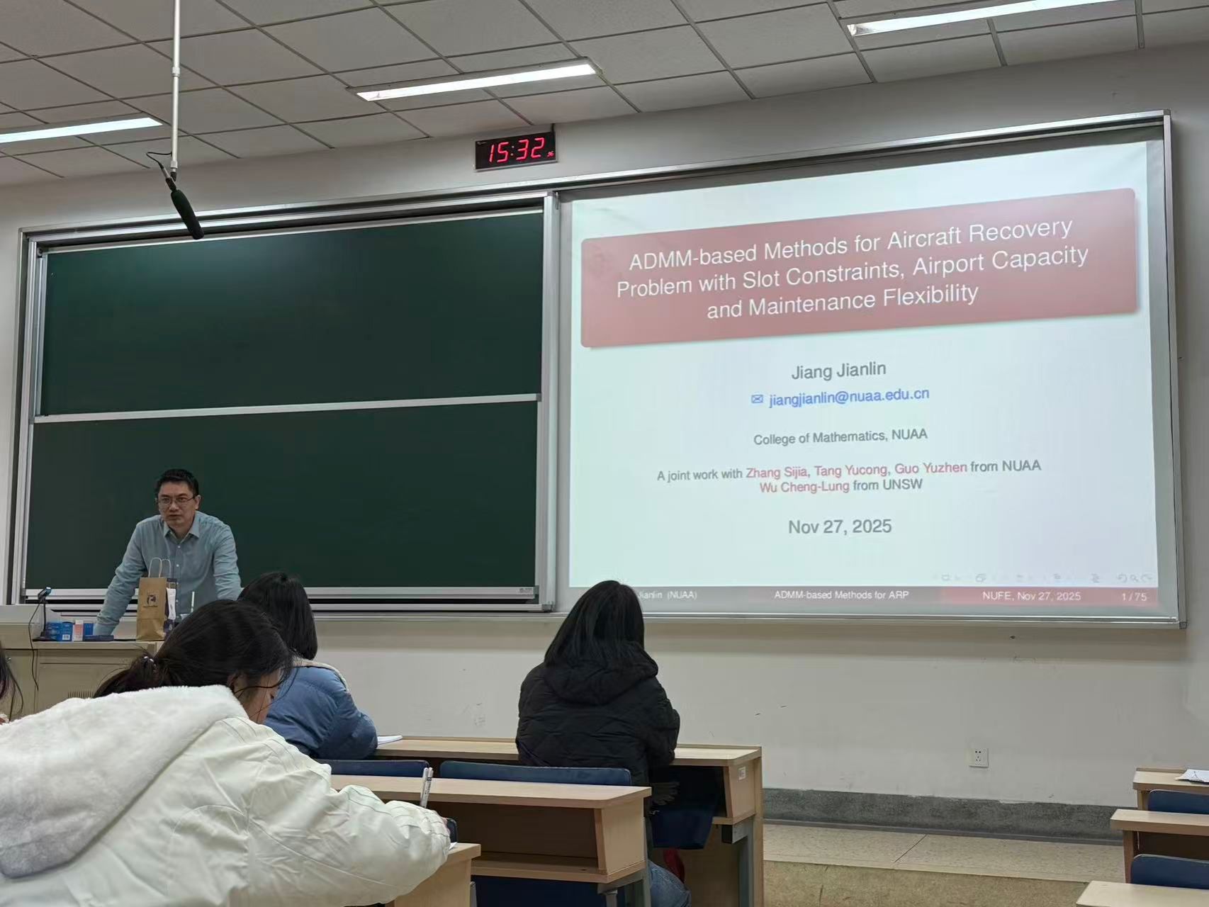 蒋建林教授介绍了客机恢复问题,以及该问题在航空管理领域的重要应用价值。蒋建林教授表示,目前对该问题的研究未考虑机场容量约束和维护灵活性,因而相关研究的实用性受限。此外,已有的算法还存在计算量过大导致无法在合理的时间内求得结果的缺陷。蒋建林教授提出了一种考虑机场容量约束和维护灵活性的客机恢复问题,并基于经典的ADMM算法求解。数值实验结果表明,从计算结果的数值精度和计算时间两个角度,新方法均显著优于已有方法。此外,新方法所得结果还满足了机场的容量约束,维护灵活性较已有方法提升了5-8倍。